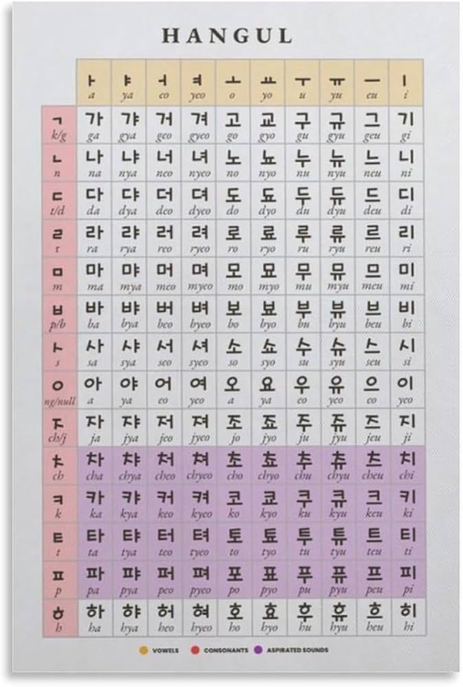 O alfabeto coreano moderno consiste em 40 caracteres (fonemas). No total: 19 fonemas para consoantes, e 21 fonemas para vogais.