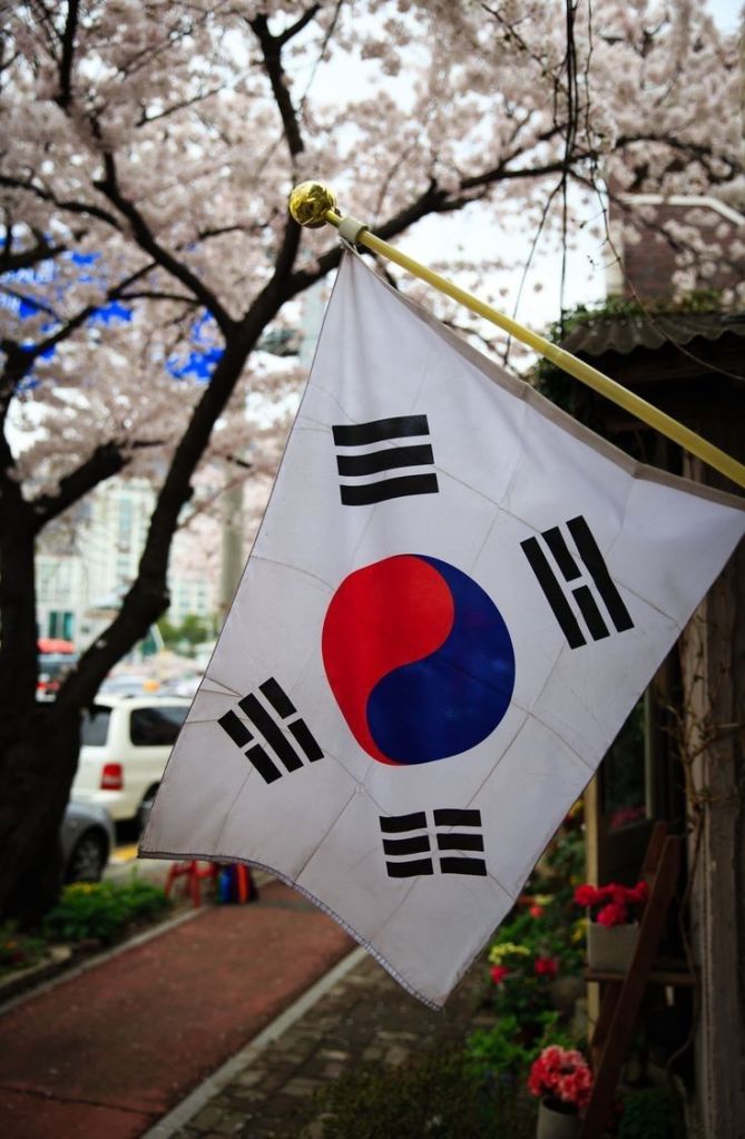 A bandeira coreana é chamada de Taegeukgi e o seu desenho simboliza o principio do yin e yang da filosofia oriental. O fundo branco simboliza brilho e pureza. O círculo no centro da bandeira é dividido em duas partes iguais. A seção superior vermelha representa as forças cósmicas proativas do yang.